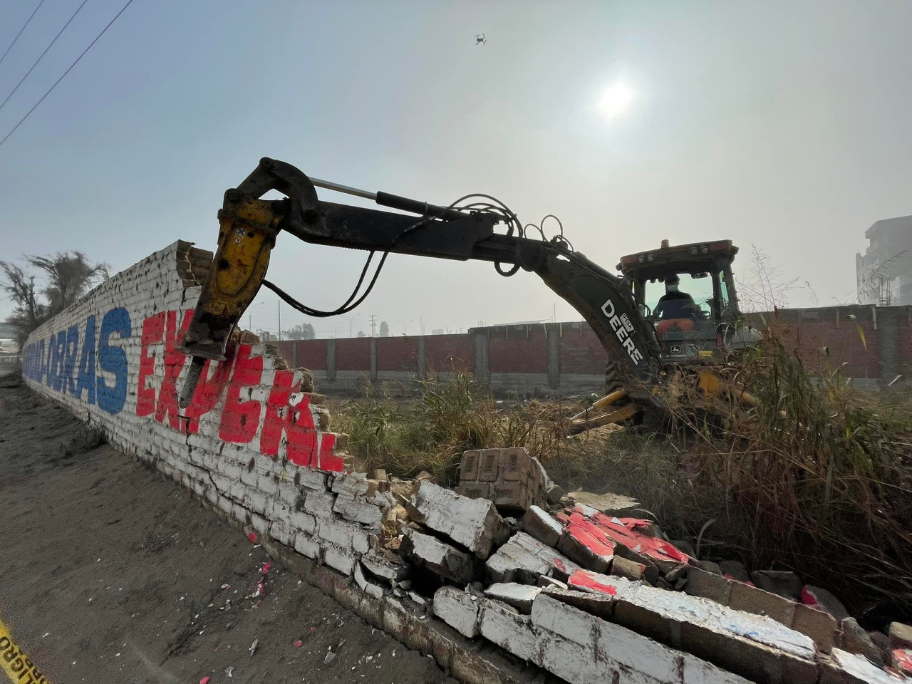 A solicitud de los vecinos, personal de la Municipalidad de Ate con maquinaria pesada, hoy derribó una pared que impedía la fluidez del tránsito vehicular en la entrada de Horacio Zeballos.